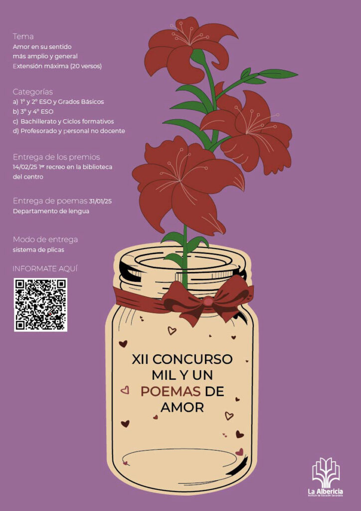 Promover la participación en un concurso de poesía cuyo tema central es el amor en su sentido más amplio y general. Este cartel combina arte y texto de manera atractiva para fomentar la creatividad literaria y la expresión emocional entre estudiantes, docentes y personal del centro.