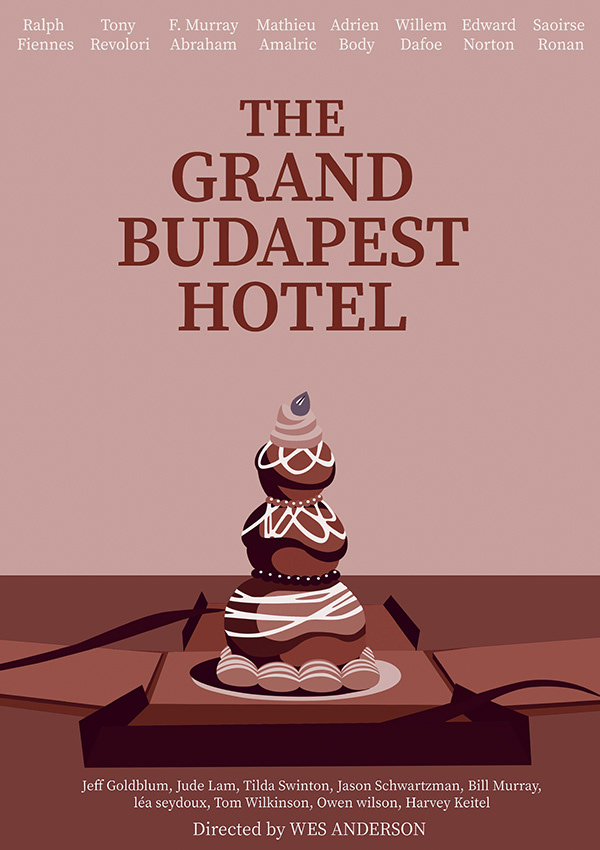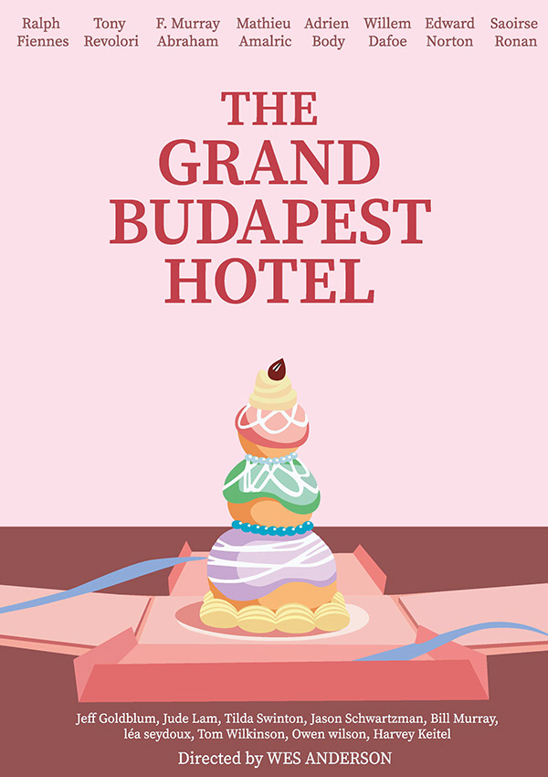 Este cartel The Grand Budapest Hotel capta a la perfección la estética distintiva de Wes Anderson: simetría, paleta de colores pasteles y un objeto central (el pastel de Mendl’s) que evoca elegancia y excentricidad. Hay dos versiones una a color y otra a dos color con sus antecedentes